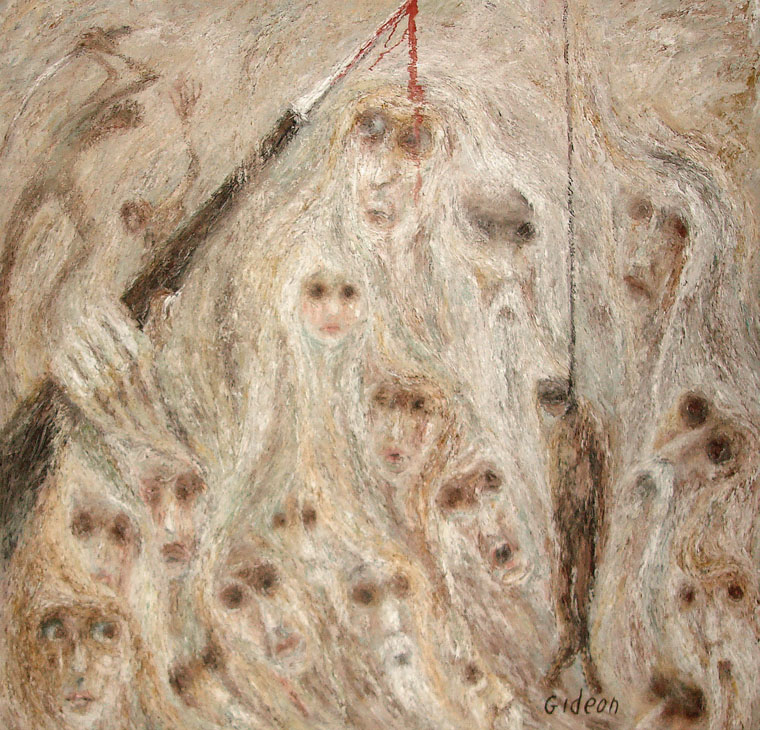 The Gideon Holocaust Art Collection is a remarkable record of the pain and suffering of World War II, created from the personal experiences and memories of American Master Artist and Sculptor Gideon. The experiences of World War II cast a permanent shadow of memory Gideon is unable to erase. His mind and his soul continually remind him of the horrors his vision had to endure. He is destined to paint and sculpt the images of the Holocaust; an emotional portrayal of a historic atrocity, a vivid reminder that such a shadow should not pass mankind’s way again.